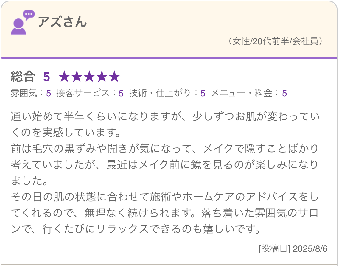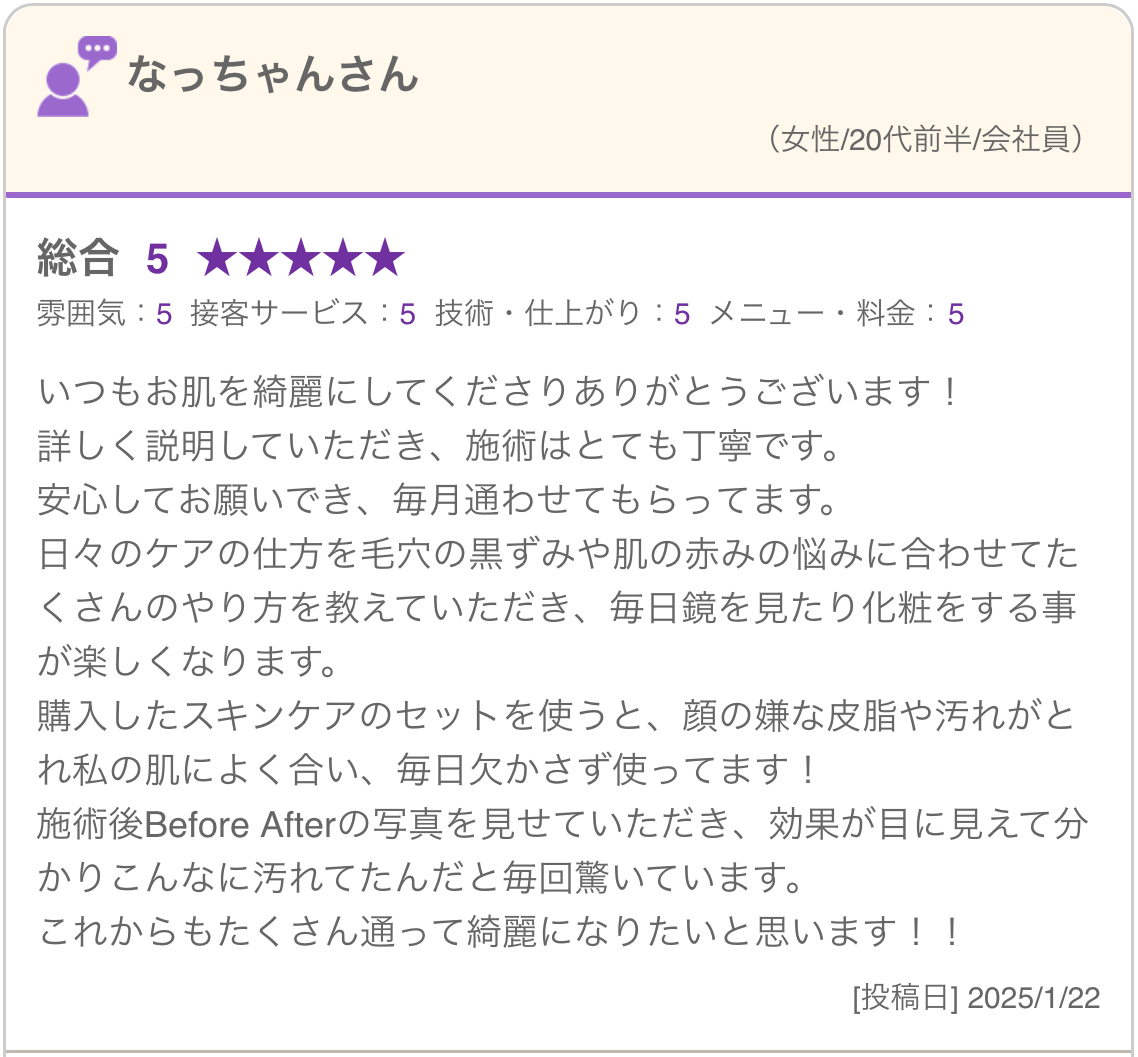 当サロンのビフォーアフターをみて、「ここなら私の肌が改善できるかもしれない」とお越しくださり、初回の施術から感動してくださいました。